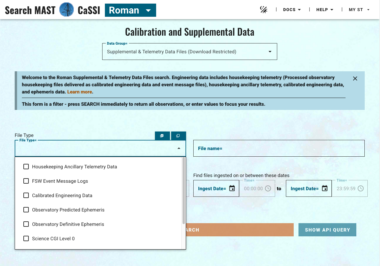 Users can access the CaSSI archive user interface. The interface has a dynamic layout which allows the access to the different categories of Roman data described above. The top menu, called "Data Group," allows users to select the type of data to explore. We show two examples of the interface which are only accessible to authorized users: the "Supplemental & Telemetry Data Files" (see Figure of the User Interface: Supplemental and Telemetry Data Files) and the RITA (see Figure of the User Interface: Roman Integration and Test Data).