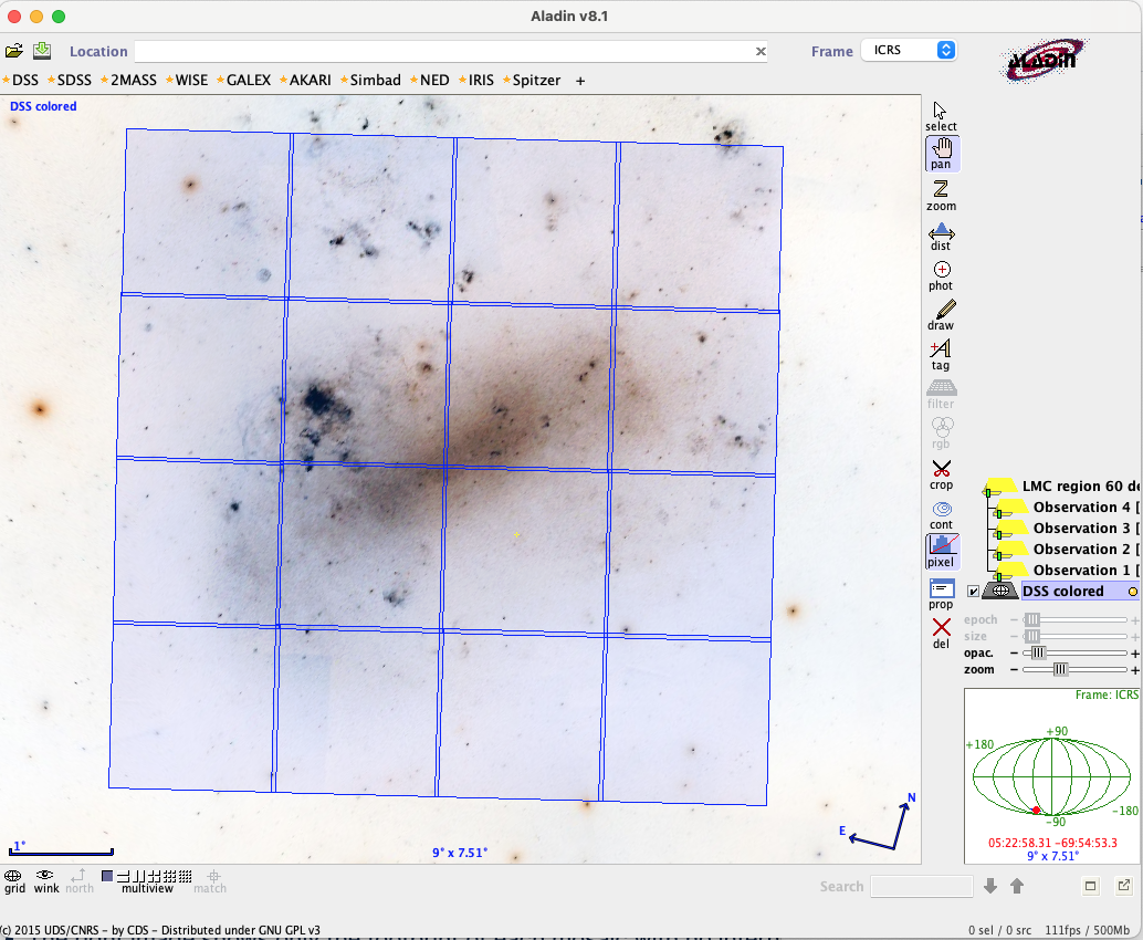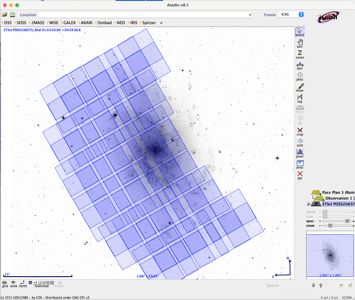 Aladin is a visualization tool integrated with APT that allows you to view program targets and instrument apertures displayed on sky images.