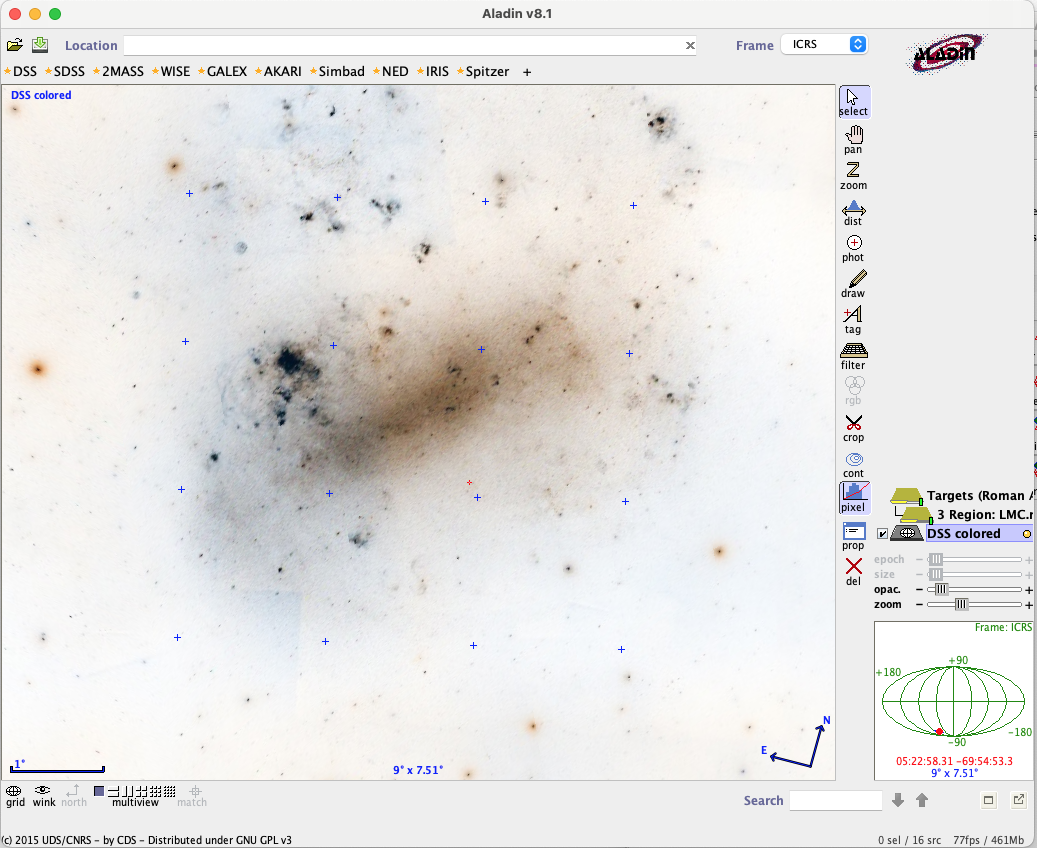 In this example, Aladin displays a Region Target with 16 points, with a small blue reticle (plus sign) at each point.