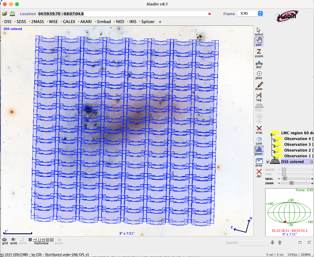 - Single Mosaic button (on the APT Aladin Controls toolbar). Displays the approximate outline of each mosaic footprint with no internal detail (see Pass Plan with Mosaic).