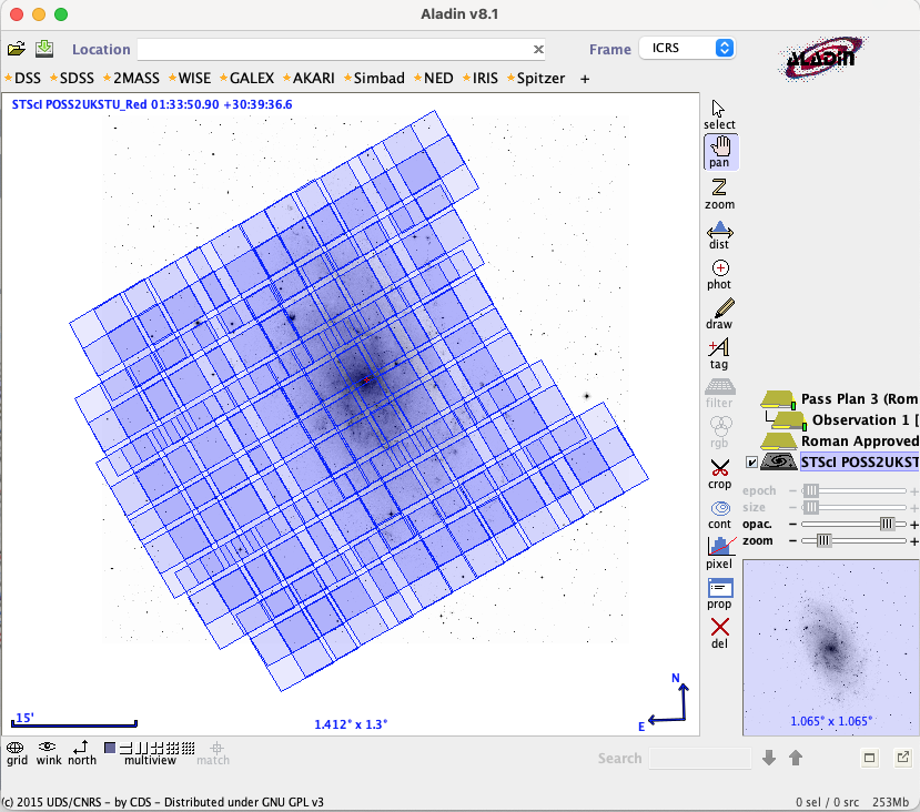 When viewing a Survey Step, APT reduces the level of detail shown on the individual pass plans, and the Single Aperture button and Single Mosaic button have no effect. This is done to ensure acceptable performance of APT and Aladin.