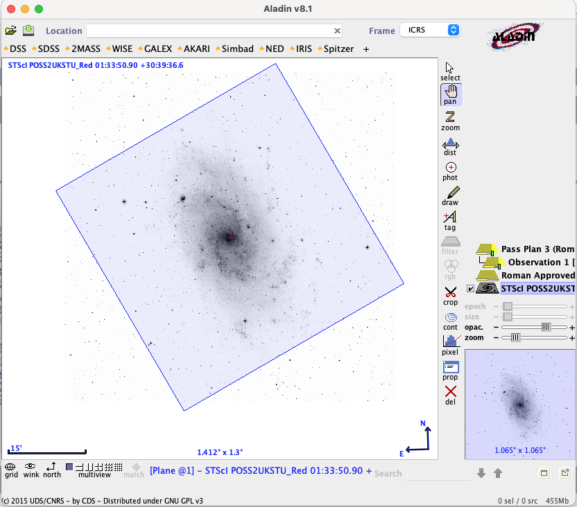 All pass plans of fixed targets are currently displayed at a default V3PA orientation of 0 degrees. You can manually rotate the display in Aladin to explore other orientations. Pass plans of region targets are displayed at the Planned Orient by default.
