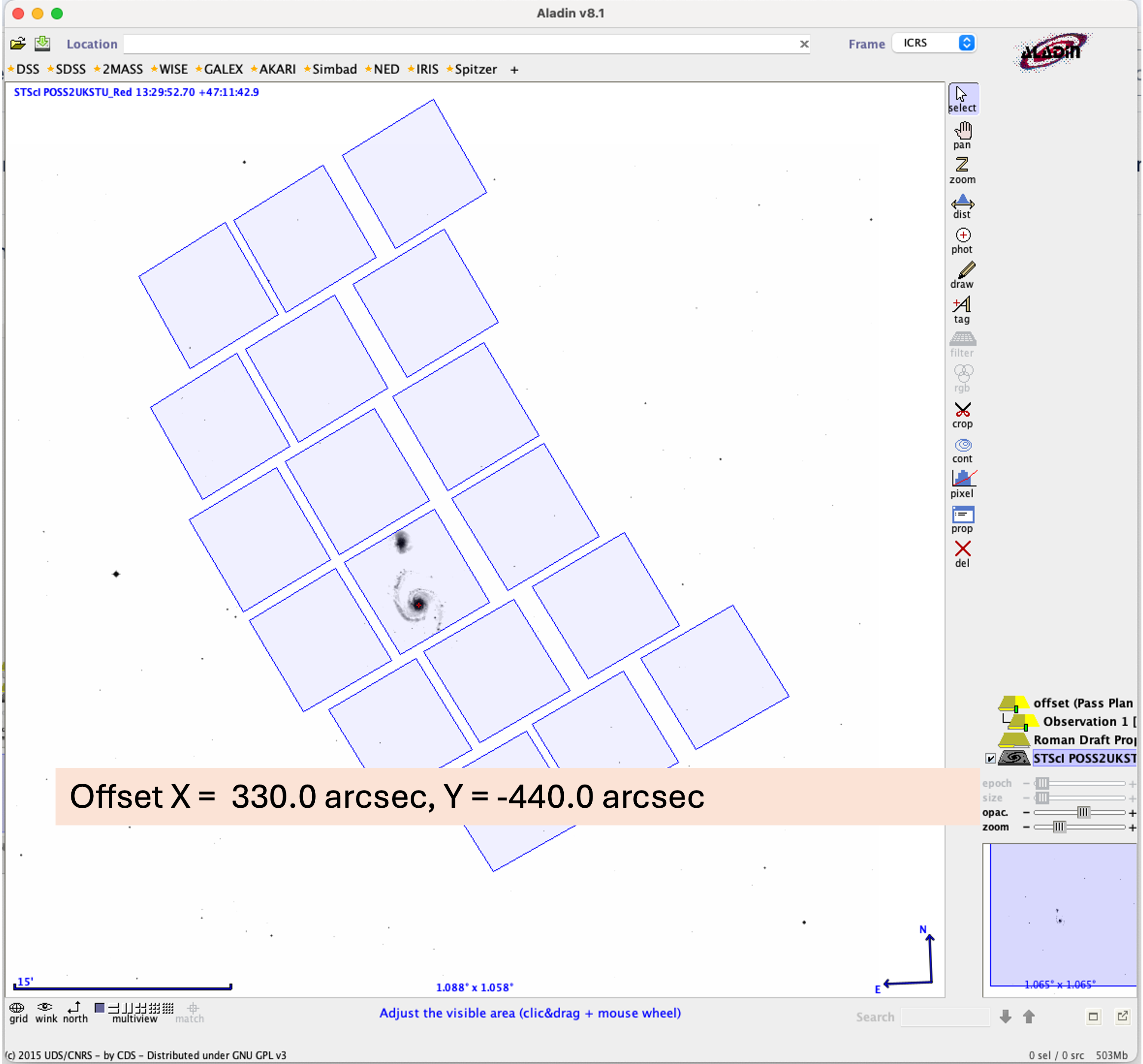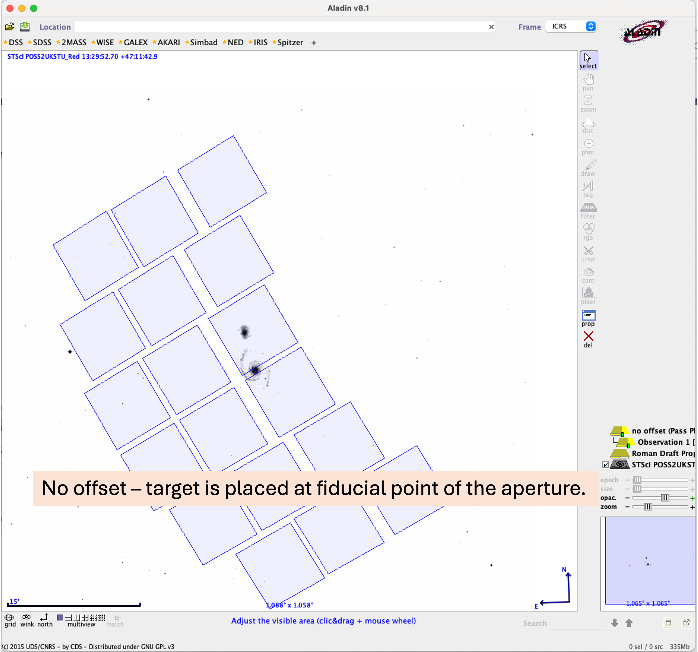 Enter OFFSET X and OFFSET Y in arcseconds. The target placement is moved from the fiducial point by the specified X and Y offset, along the X and Y axes of the ideal frame. For more information on ideal frame and fiducial point, see Coordinate Systems.