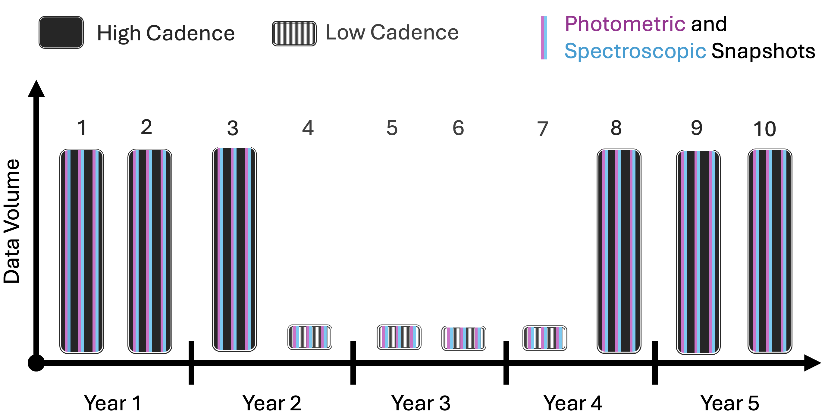 - High Cadence Seasons occur at the beginning and end of Roman’s five-year mission (six bulge seasons total). The full survey area is imaged in F146 approximately every 12 minutes for ~70.5 days. The long temporal baseline between the first and last high cadence season maximizes science return, enabling exoplanet microlensing characterization, discovery of longer-period transiting exoplanets, and asteroseismic studies. Each high cadence season includes three Photometric Snapshots and three Spectroscopic Snapshots, obtained at the beginning, middle, and end of the season.