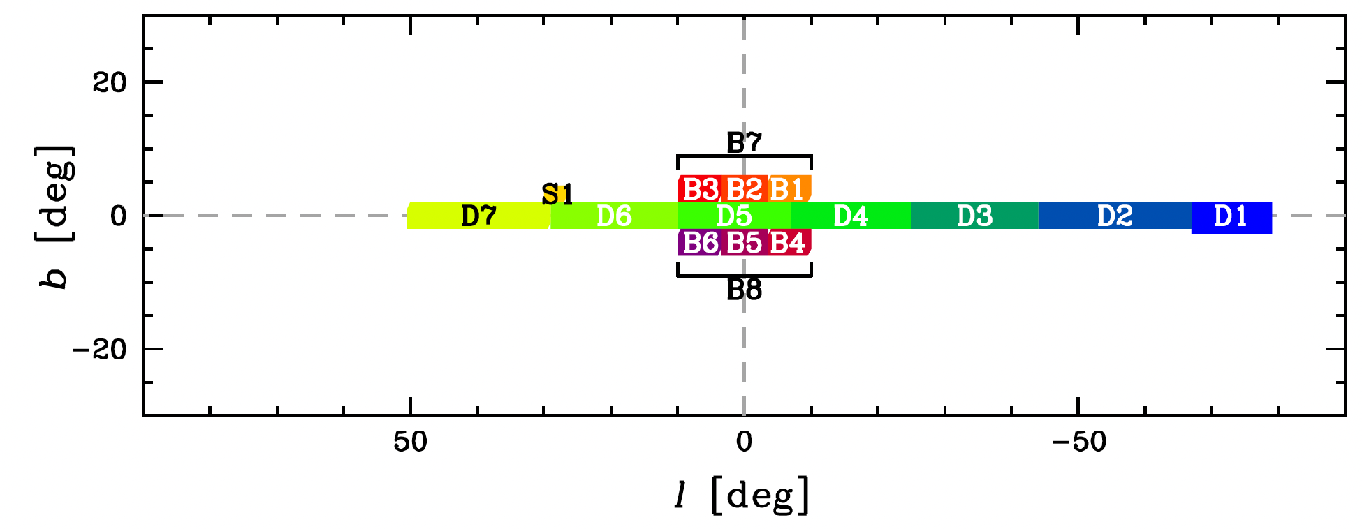 The GPS wide-field element survey is divided into region targets to ease schedulability. Their extent and location are shown here in Galactic coordinates. Disk region targets are labelled D1 to D7. Bulge region targets are labelled B1 to B6 for first-epoch observations (2 filters) and 7 and 8 for second-epoch observations (1 filter only, allowing larger regions). Serpens South has its own region target, labelled as S1.