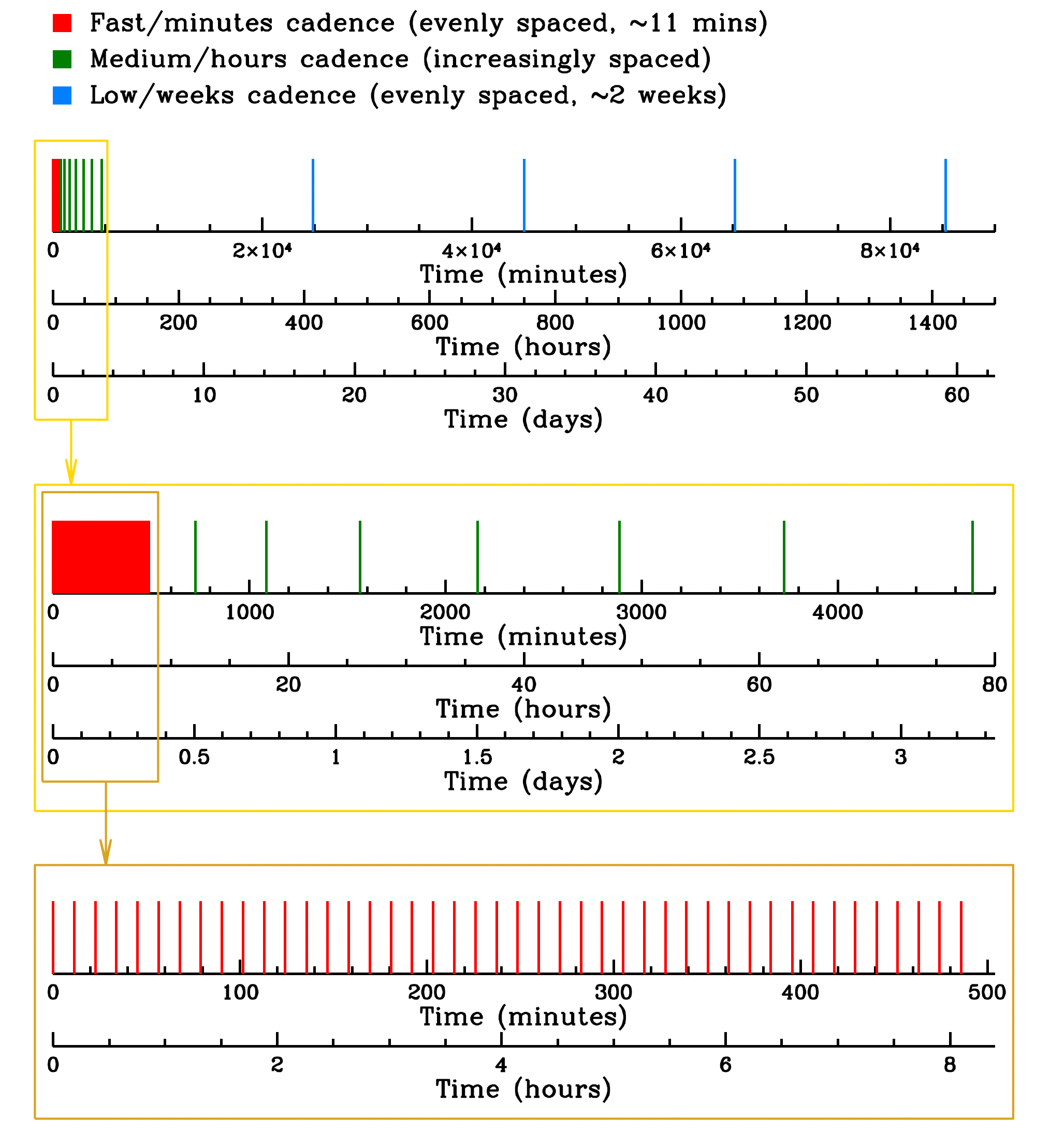 A graphical representation of the cadence of the three types of time-domain observations (fast/minutes, medium/hours, low/weeks) is shown in the Illustration of the Three Types of Cadence for the GPS.
