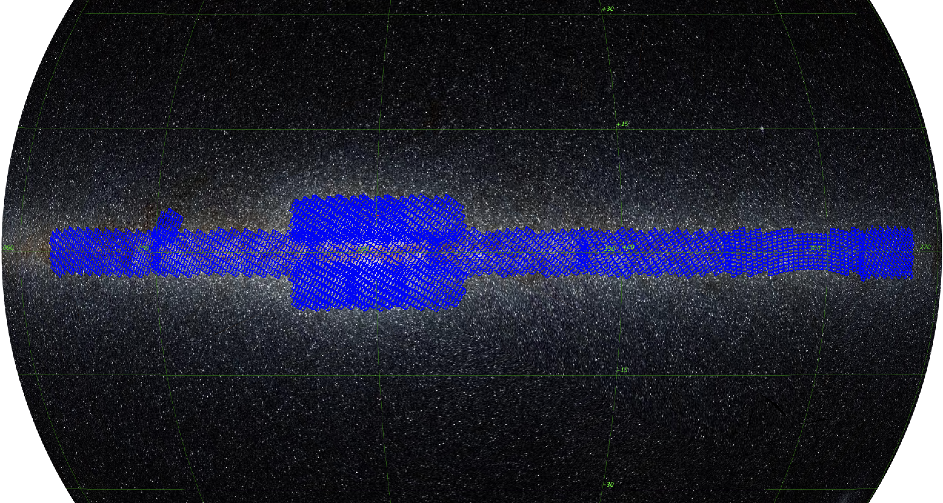 APT/Aladin view of the current implementation of the GPS wide-field element observations, in Galactic coordinates, superimposed on a 2MASS sky image. The surveyed area is divided into distinct region targets. The orientation of the pointings in each region target is only indicative. Once observations are in the scheduling system and the position angle of the telescope is known, the overlapping tiles at the boundaries between different region targets, as seen in this implementation, can be removed to improve efficiency.