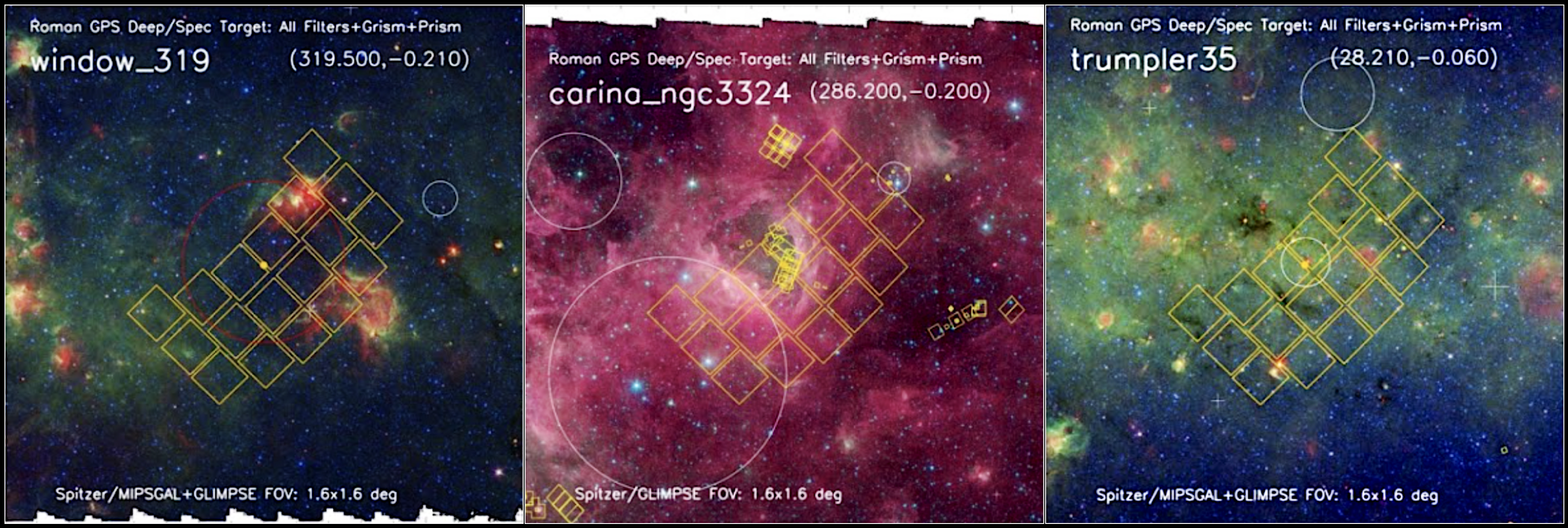 Examples of Deep/Spectroscopic observations superimposed on Spitzer+GLIMPSE+MIPSGAL backgrounds. HST pointings (shown in yellow and white circles) show the direction of open clusters from the catalog of Hunt & Reffert (2023). From left to right: Window 319, Carina & NGC 3324, and Trumpler 35. Credits: GPSDC report.