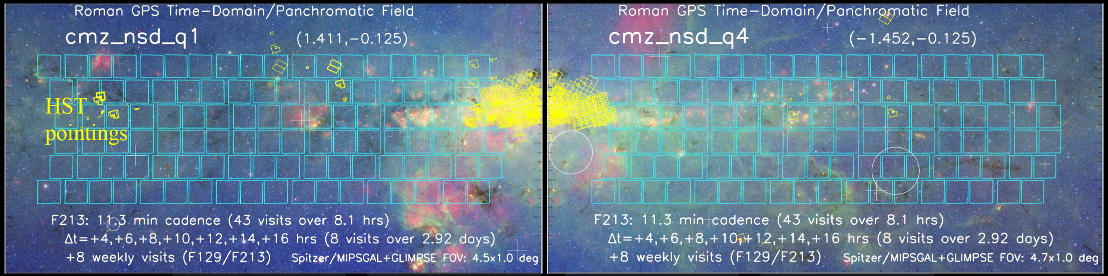 - Galactic Center (two fields): Multiple cadences with minutes (F213), hours (F213; cadence increases over time), and weeks (F129 and F213).