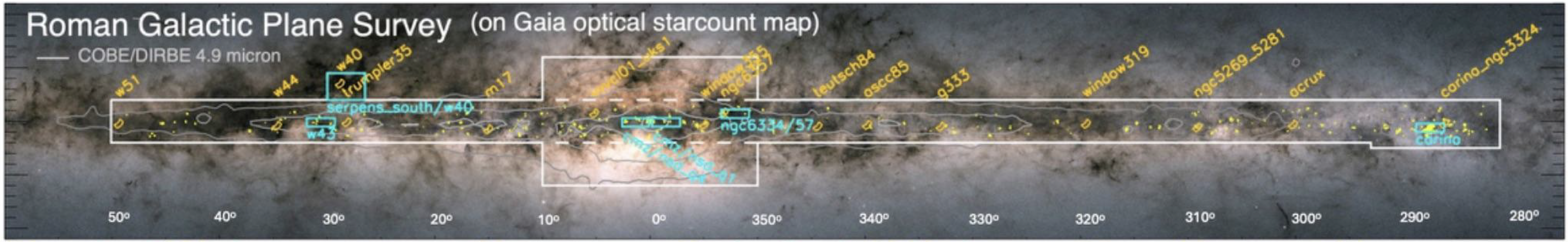 Fifteen individual Roman pointings spanning the full Galactic-longitude range of the wide-field element. A complete list of pointings and optical elements is provided in the Overview Table of the GPS Observations; targets include massive star-formation regions, open clusters, globular clusters, W44, IR extinction windows, the Alpha Crux bow shock, and W40 (deeper field: F129, F158, F213 + Prism).