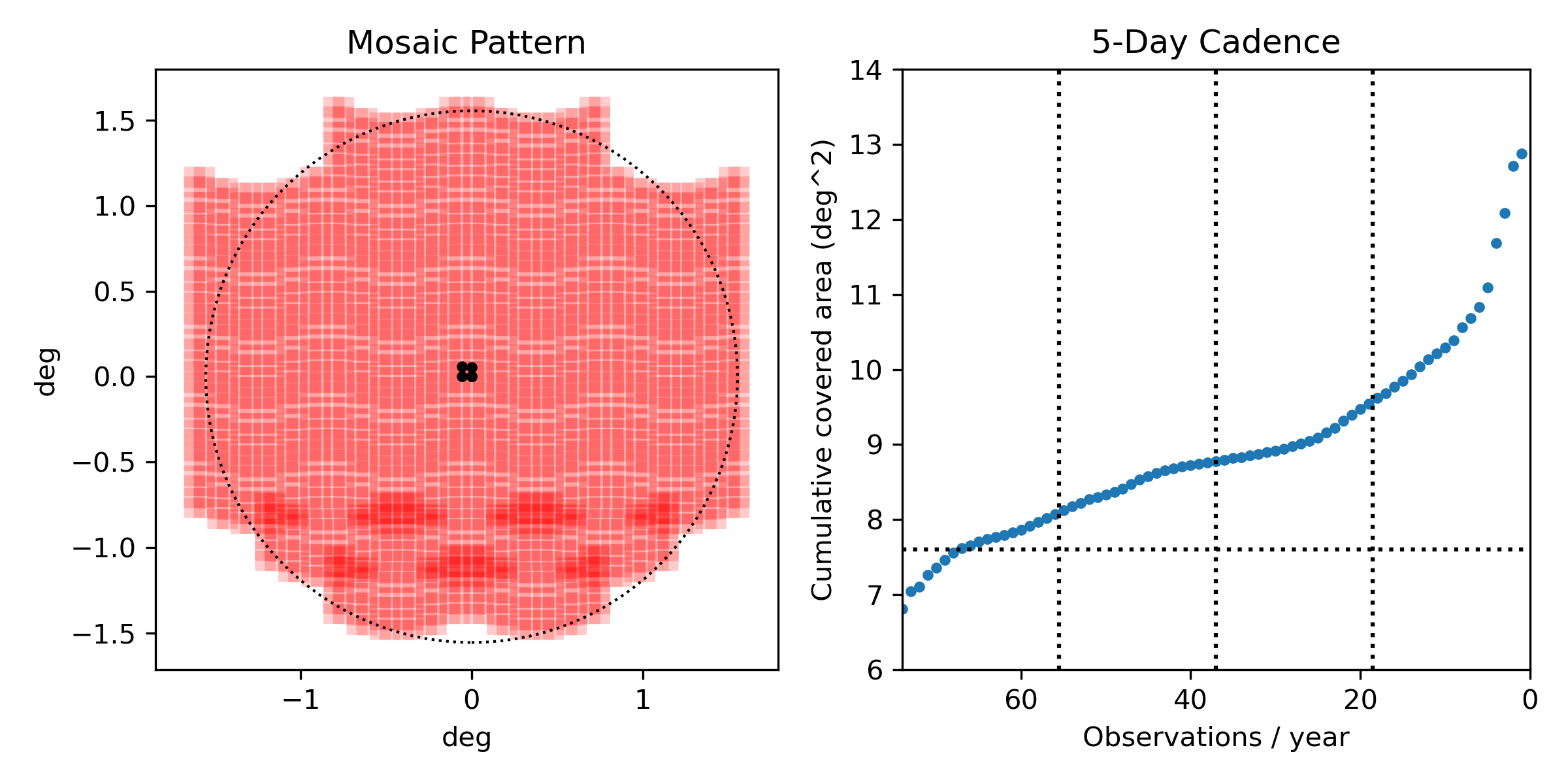 Left: pseudo-dithered mosaic pattern used in the southern field. Right: cumulative area of regions covered as a function of the number of epochs when revisiting every 5 days over one year (72 total epochs). The horizontal dotted line in the right panel marks the area with 90% epoch overlap and is same area that is enclosed by the dotted circle in the left panel.