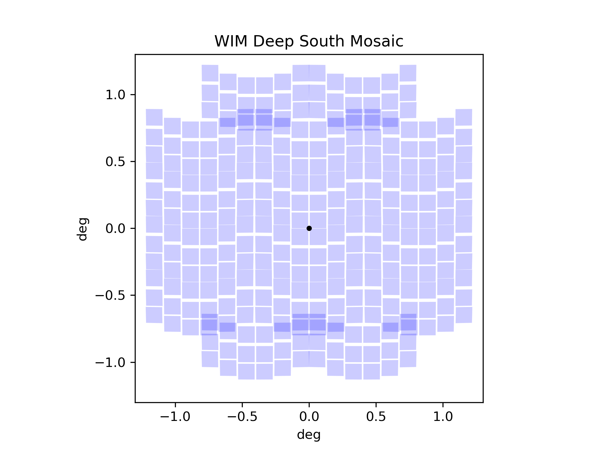 All six mosaic patterns used in the HLTDS with deep tier mosaics in red and wide tier mosaics in blue for both the WFI Imaging Mode (WIM) and WFI Spectroscopy Mode (WSM) observations. Overlapping mosaics with the same imaging mode are over-plotted.