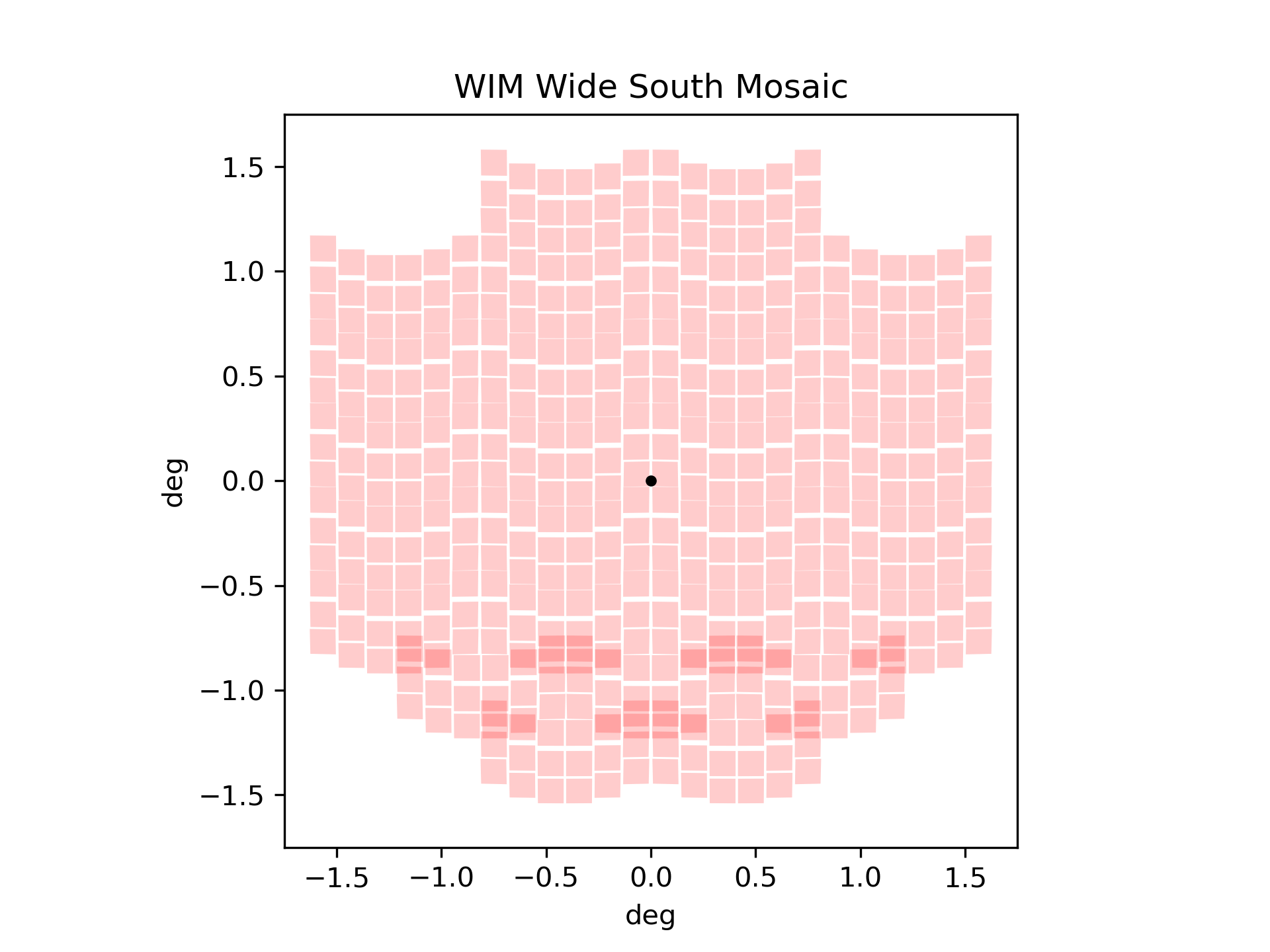 In the southern field, the wide and deep imaging tiers are implemented as two independent mosaics. The wide imaging mosaic consists of 27 pointings, covering 8.9 deg2 per epoch, while the deep imaging mosaic comprises 16 pointings, covering 5.3 deg2 per epoch. Both spectroscopic tiers overlap the deep imaging region: the wide spectroscopy mosaic includes the outer 14 pointings, and the deep spectroscopy mosaic consists of the central two, covering 0.5 deg2 per epoch. The full spectroscopic footprint covers 5.3 deg2 per epoch at differing depths, with the central region observed only by the deep tier. The mosaic patterns are shown in the Figure of HLTDS Mosaic Patterns.