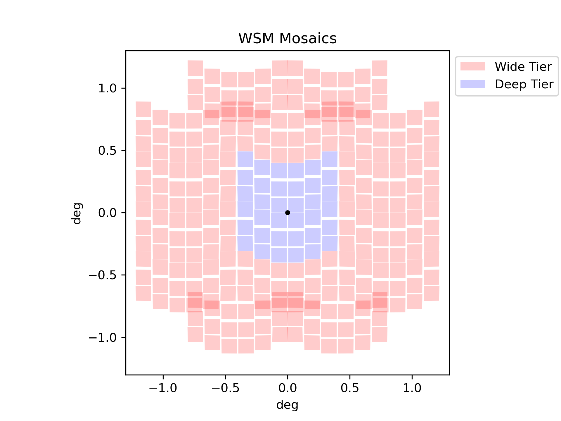 The Wide Imaging Tier uses 38 pointings arranged in a torus. The Deep Imaging Tier fills the center region with 7 pointings, providing 2.4 deg2 per epoch. In this design, the wide-tier mosaic deliberately omits the center, already imaged by the deep tier, so that its pointings can be pushed outward to expand coverage in the exterior regions. Taken together, the wide and deep tiers cover 14 deg2 per epoch, with the central area imaged exclusively by the deep tier. The mosaic pattern is shown in the Figure of HLTDS Mosaic Patterns.