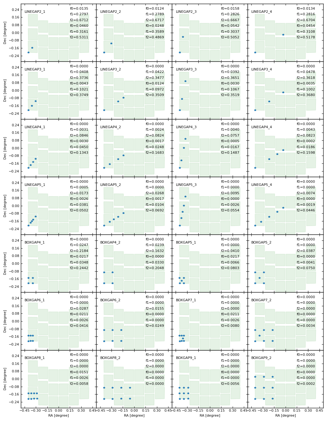 Reference graphics for the 28 dither patterns available for Roman. Each panel shows a single dither pattern showing all of the LINEGAP patterns and then the BOXGAP patterns in order of number of pointings. The WFI footprint is shown in green at the first dither step and the blue stars show the other dither positions relative to the first step. As described in Computation of Coverage Statistics for GAP Dither Patterns, the coverage fractions (f0, f1, f2) are shown. The coverage fraction represents the fractional area with an equivalent depth of 0, 1, or 2 images in cases where the tiles in the mosaic pattern are aligned (top three numbers) or unaligned (bottom three numbers). In the section Dither Patterns, figures are provided for each pattern to show the exposure depth and are organized by number of pointings.