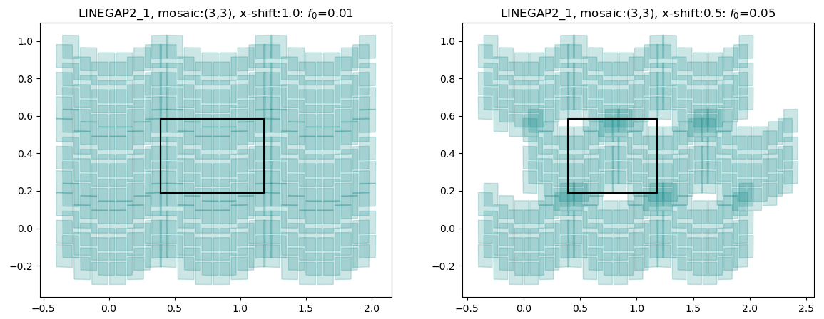 The black lines denote the fiducial rectangle that is used for computing the coverage fraction. It is of size 0.79° x 0.395° and is located at the center of 3x3 mosaic pattern. In the left panel, the left and right edges of WFI tiles are aligned vertically, while in the right panel they are displaced by half the width of a WFI tile.